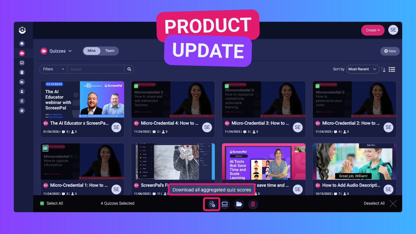 Tracking quiz performance just got easier! You can now export aggregated quiz results directly from your ScreenPal account.
